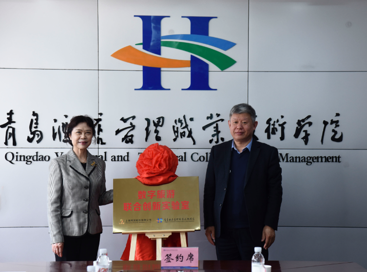 中国旅游协会旅游教育分会刘莉莉秘书长和青岛酒店管理职院李达书记为云驴通数字旅游联合创新实验室揭牌
