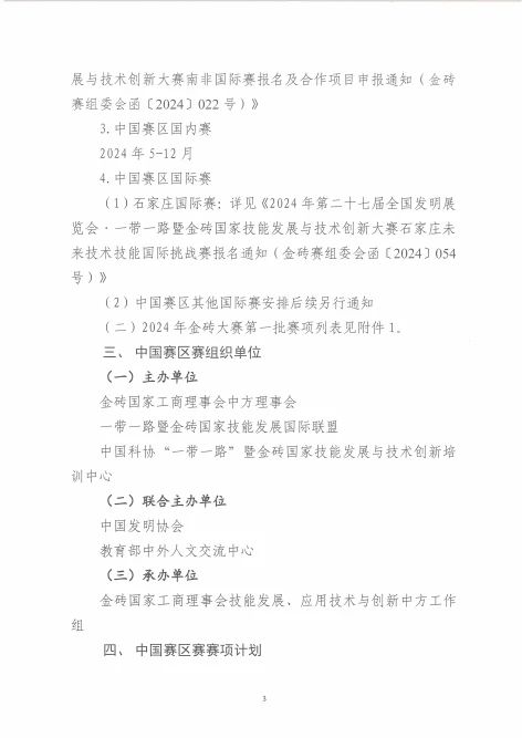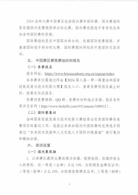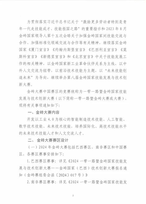 2024金砖大赛中国赛区包括国内赛和国际赛。国内赛指的是依据国内竞赛规程举办的比赛。国内赛优胜选手享有优先参加金砖国际赛的资格。