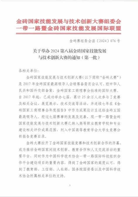 2024-07-15金砖国家技能发展与技术创新大赛(以下简称“金砖大赛”)是2017年金砖国家最高领导人会晤筹备委员会认可、经中华人民共和国外交部备案、金砖国家工商理事会批准的国际大赛。自2017年起,已成功举办七届,累计25余万人次参与了竞赛及相关会议、展览展示、技术交流等活动,并连续七年在《金砖国家工商理事会年度报告》中作为成果设计呈送给金砖五国最高领导人。经过七届赛事的发展及完善,现一带一路暨金砖国家技能发展与技术创新大赛已纳入高等职业教育学校和专业建设相关评价成果范围,列入中国高等教育学会大学生竞赛分析报告竞赛目录。