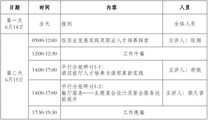 2024-07-16为贯彻党的二十大精神,落实《关于深化现代职业教育体系建设改革的意见》、《国家职业教育改革实施方案》文件精神,着力提升酒店类院校师资的专业素质和教学水平,拓展教师科研能力和行业视野,根据中国饭店协会 2024 年度工作安排,定于 6 月在苏州举办“全国酒店类专业教师职业能力提升与课程革新研修班”。