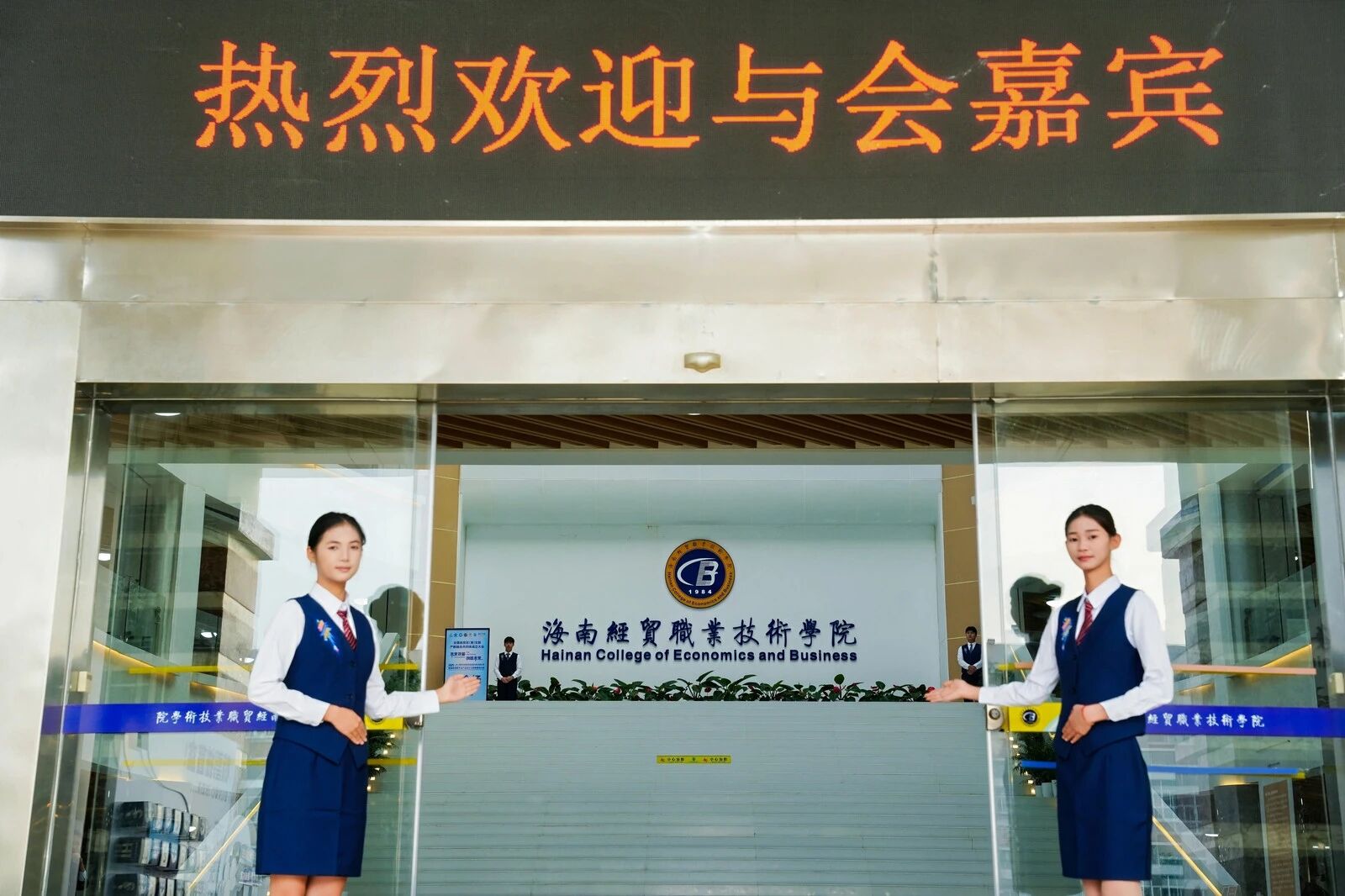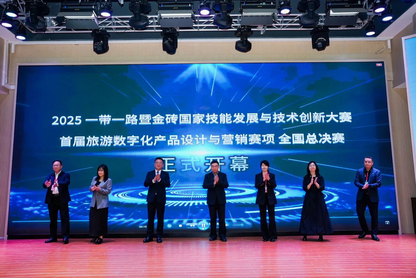 宣誓仪式后,海南经贸职业技术学院党委副书记校长崔昌华、金砖国家技能发展与技术创新大赛组委会执委会国内竞赛办公室一处处长时佳、大赛裁判长郑州旅游职业学院党委书记王艳红、大赛专家组长河南职业技术学院文旅学院院长陈佳平、大赛总顾问全国旅游行业教学指导委员会副主任委员浙江旅游职业学院教授王昆欣、大赛监督组长新疆克拉玛依职业技术学院副校长刘旭莹、安徽云驴通信息技术有限公司总经理冯伦雲 7 位领导共同上台,启动本次赛项开幕,现场掌声雷动,气氛热烈。