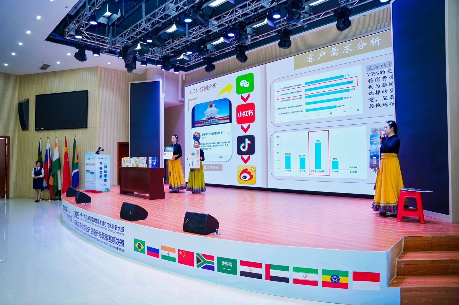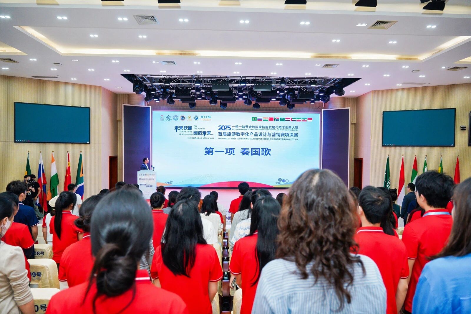 伴随着庄严的国歌旋律,全体与会人员起立肃立,开幕式正式拉开帷幕。金砖国家技能发展与技术创新大赛组委会执委会国内竞赛办公室一处处长时佳率先致开幕词。她指出,本次旅游数字化设计与营销创新赛项紧扣 “一带一路” 与金砖国家合作发展主线,聚焦旅游产业数字化转型趋势,为中外技能人才搭建了交流展示、互学互鉴的优质平台。希望参赛选手以赛促学、以赛促练,充分展现新时代技能人才的创新活力与专业素养,为文旅产业高质量发展注入新动能。